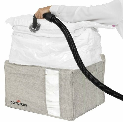 Kompresný vak Oxford XL od Compactor je uložený v modernom polo-vystuženom úložnom boxe. Pojme textílie s objemom 150 l. Ideálne na ukladanie sezónneho oblečenia. Uložené veci sú vo vnútri hermeticky chránené a zaberú len 25 % pôvodného miesta. materiál: polyester, bavlna