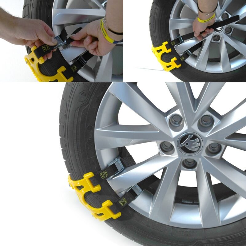 Univerzálne vyslobodzovacie pásy slúžia pre núdzové vyslobodenie zo snehu aj poľadovice. Sú vhodné pre všetky bežné rozmery pneumatík (ALU i oceľové disky). Dokonalé upevnenie s rýchlou a zároveň jednoduchou montážou je zaistené sťahovacími pásmi s prackami.