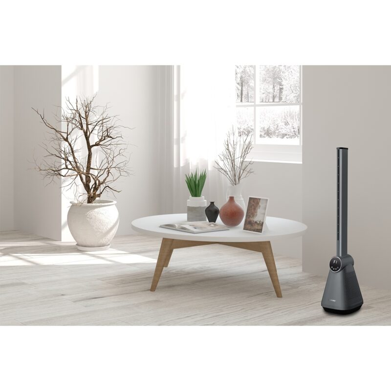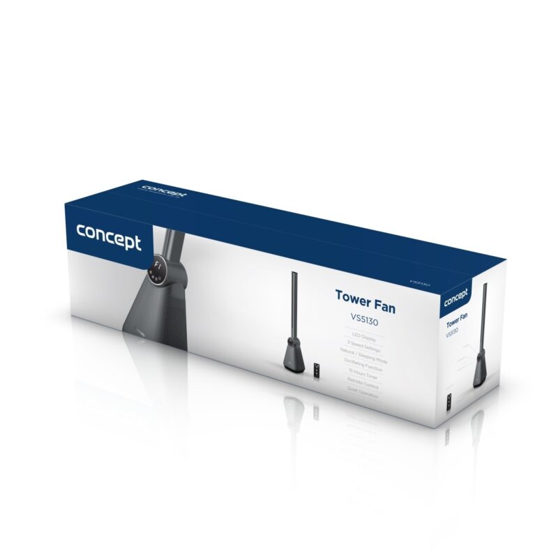 Stĺpový ventilátor Concept VS5130 prinesie príjemné ochladenie počas horúcich letných dní. Vyniká elegantným dizajnom, vďaka ktorému sa hodí do každej modernej domácnosti. Veľkou prednosťou je jeho moderný bezlopatkové prevedenie, čo ocenia predovšetkým domácnosti s malými deťmi, pretože eliminuje nebezpečenstvo úrazu. Ventilátor je vybavený stabilnou základňou, ktorá zaisťuje maximálnu bezpečnosť počas prevádzky a zabraňuje nechcenému prevrhnutiu. S príkonom iba 50 W sa radí medzi veľmi úsporné spotrebiče.Ventilátor ponúka 3 úrovne prúdenia vzduchu a funkciu oscilácie, ktorá začne plynulé natáčanie pre lepšiu cirkuláciu vzduchu v miestnosti. Nechýba ani časovač s nastavením až na 15 hodín, čo oceníte napr. večer počas zaspávania. Po uplynutí zvoleného času sa ventilátor automaticky vypne.Ventilátor môžete pohodlne ovládať pomocou panela na tele spotrebiča alebo diaľkovým ovládačom. Každá funkcia má svoje vlastné tlačidlo, takže ovládanie je veľmi jednoduché a intuitívne. Jednoducho tak zvolíte intenzitu prúdenia vzduchu, otáčanie, časovač alebo prevádzkový režim pomocou diaľkového ovládania. Nastavené hodnoty môžete kontrolovať na prehľadnom LED displeji.Technické parametre: