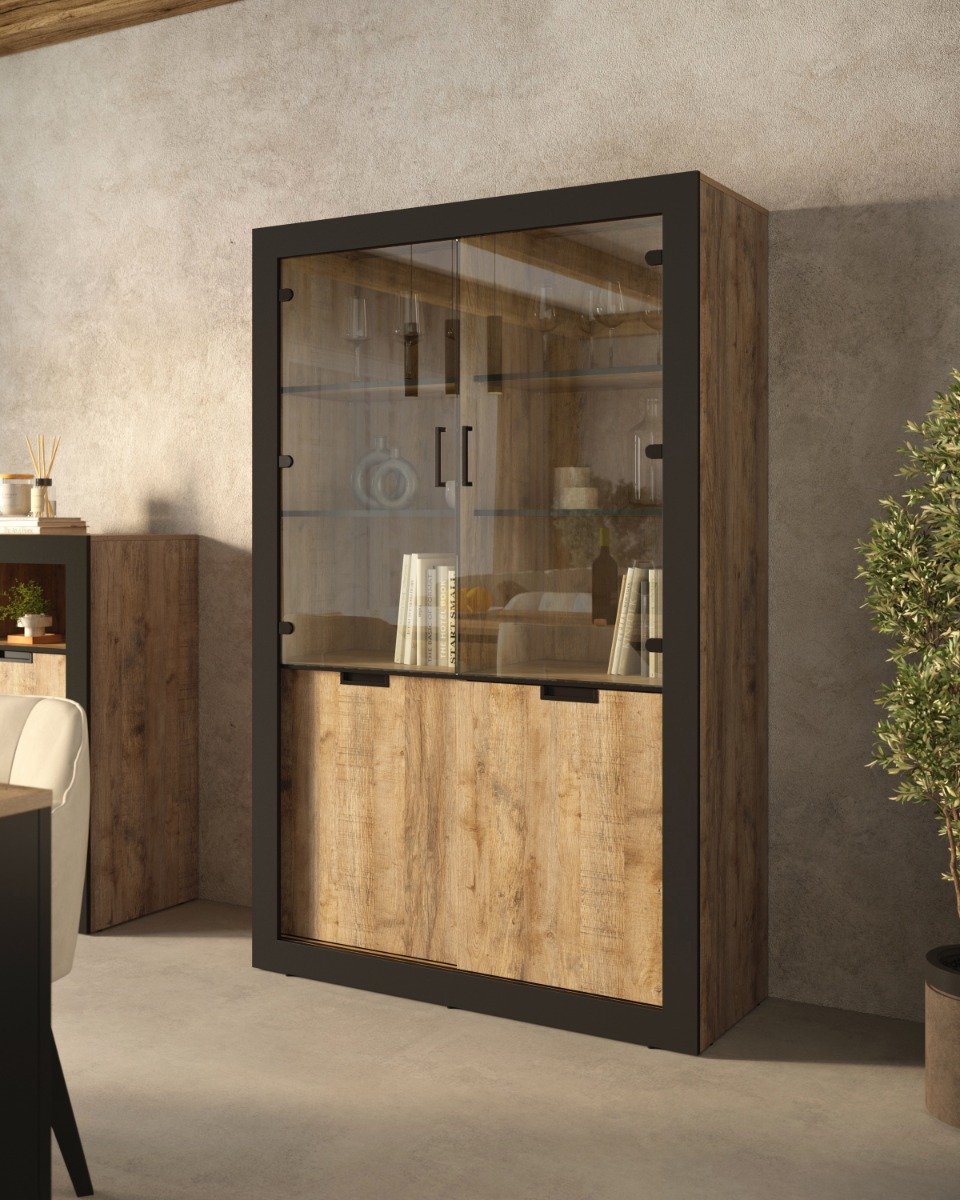 Vitrína COOP – elegantná kombinácia úložného priestoru a moderného dizajnuVitrína COOP je ideálnou voľbou pre vašu obývaciu izbu. Spája moderný štýl s praktickým úložným priestorom, ktorý je doplnený presklenými dvierkami na vystavenie dekorácií alebo skleneného riadu.Hlavné vlastnosti produktu:Typ tovaru: VitrínaVhodné do miestnosti: Obývacia izbaMateriál: LTDFarba: dub Samdal/čierna matRozmer: 187 x 120 x 45 cmVybavenie: Dvierka plné, dvierka presklenéPočet dvierok: 4Dodatočné informácie: Dodávame v demonteVitrína COOP kombinuje uzavretý úložný priestor s presklenými sekciami, ktoré umožňujú elegantne vystaviť vaše obľúbené predmety. Štýlový kontrast dubového dekoru s čiernymi prvkami dodáva nábytku sofistikovaný vzhľad, ktorý sa hodí do každého moderného interiéru.