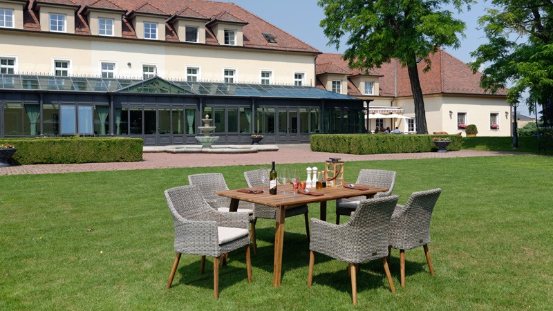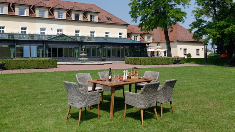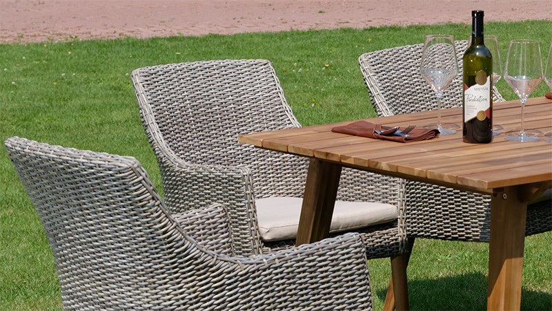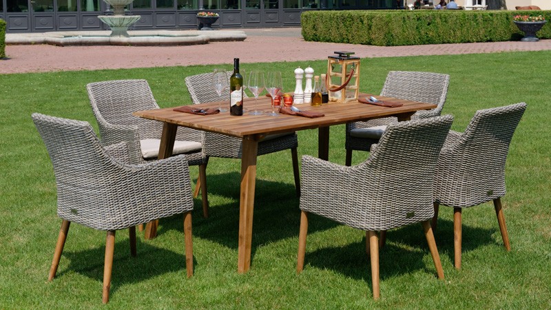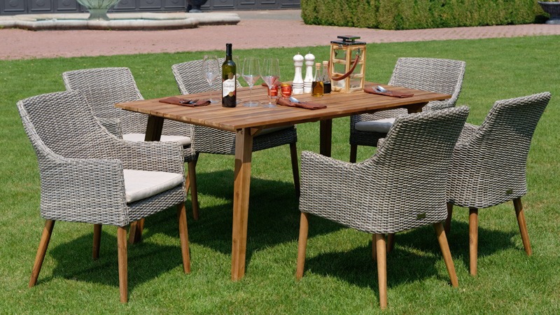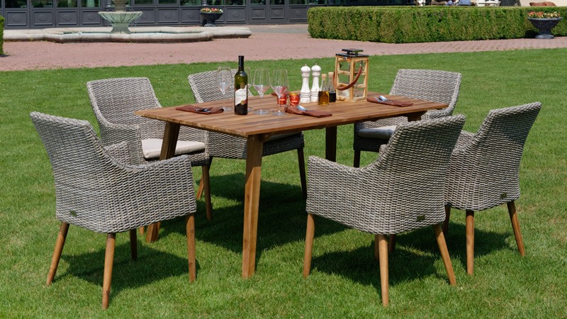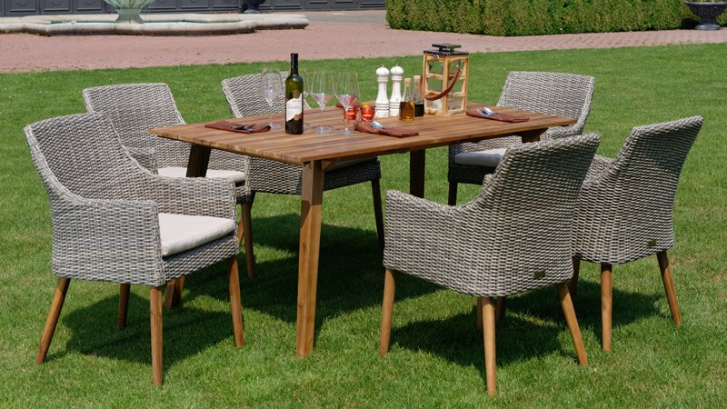 Elegatná 7-dielna stolová zostava Copenhagen Faro v kombinácii agátového dreva a výpletu z umelého ratanu.
