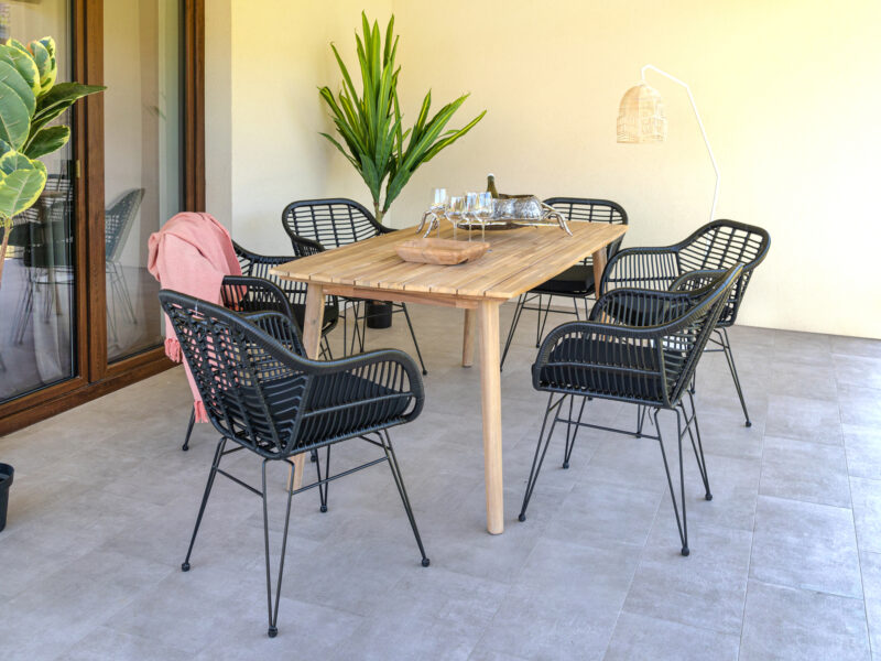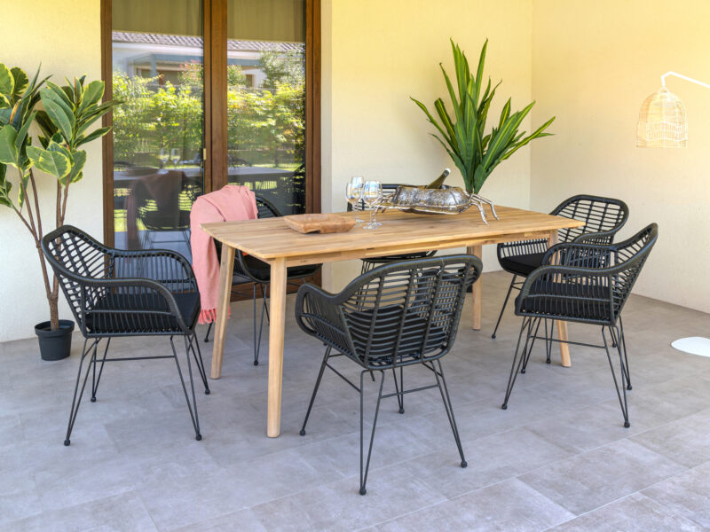 Súprava Copenhagen Trieste kombinuje štýlové stoličky s pohodlným podsedákom a pevný exteriérový stôl z agátového dreva s teakovou úpravou. Ideálna na terasu, do záhrady alebo menší interiér – praktická, odolná a elegantná zároveň.