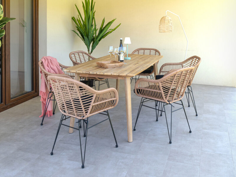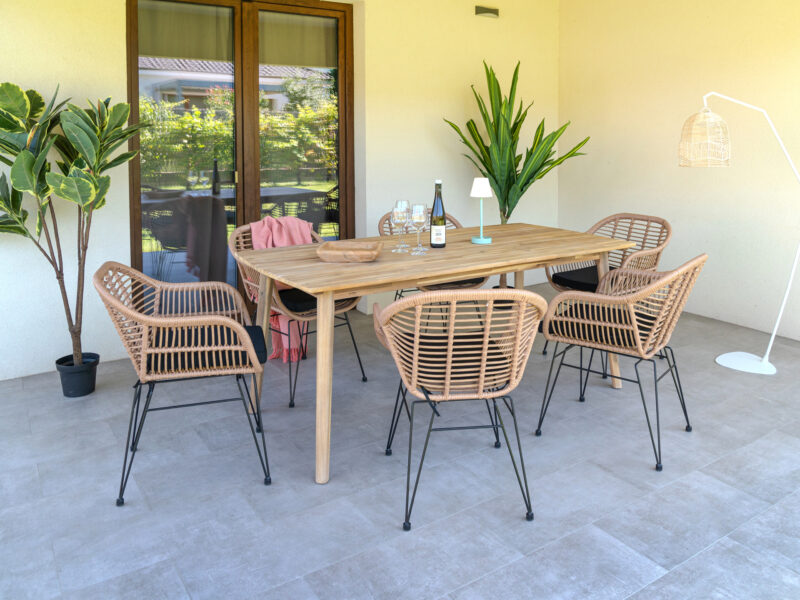 Súprava Copenhagen Trieste kombinuje štýlové stoličky s pohodlným podsedákom a pevný exteriérový stôl z agátového dreva s teakovou úpravou. Ideálna na terasu, do záhrady alebo menší interiér – praktická, odolná a elegantná zároveň.