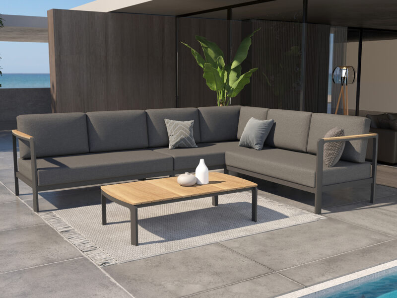 Štýlová sedacia súprava v rohovom prevedení. Minimalistický dizajn, ktorý perfektne zapasuje do akejkoľvek záhrady či na terasu.