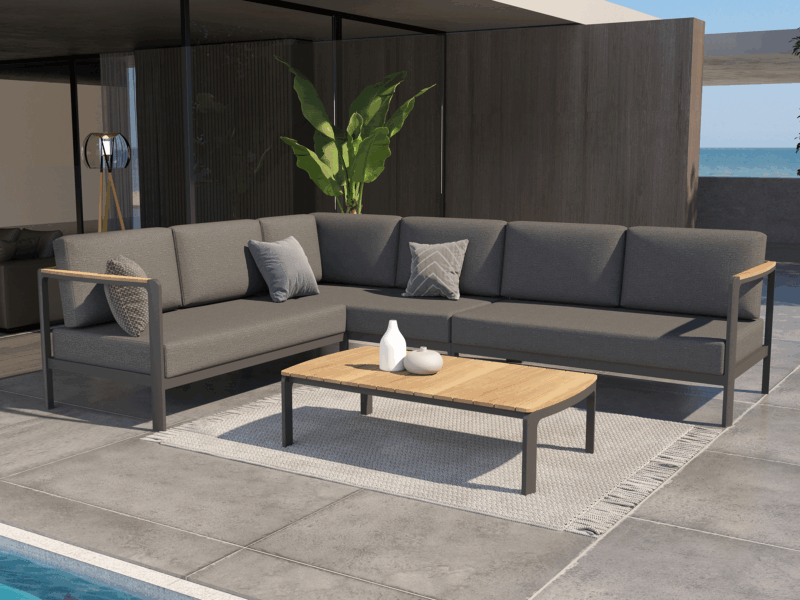 Štýlová sedacia súprava v rohovom prevedení. Minimalistický dizajn, ktorý perfektne zapasuje do akejkoľvek záhrady či na terasu.