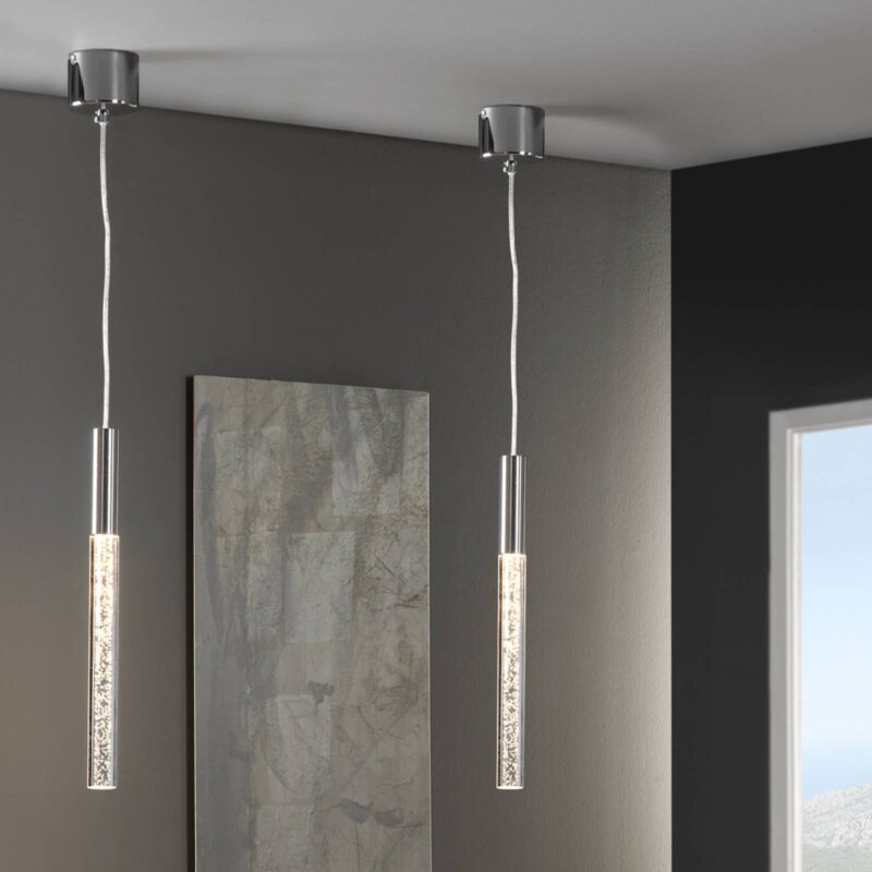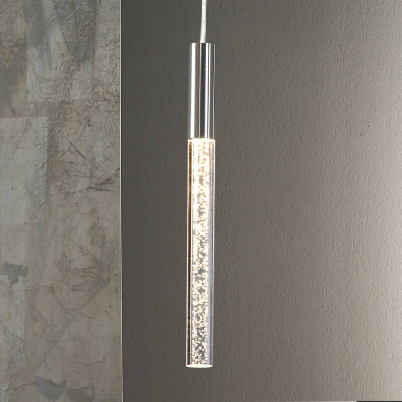 Cosmo – skvelé LED závesné svietidlo Úzka, jednoplameňová závesná lampa Cosmo je vďaka bublinkám, ktoré zdobia vnútro číreho akrylového tienidla, skvelou pastvou pre oči, kdekoľvek sa používa. Priehľadná akrylová trubica je umiestnená v držiaku z pochrómovaného kovu, aj baldachýn bol pochrómovaný. Do trubice bola nainštalovaná 5 W dióda LED poskytujúca teplé biele osvetlenie a účinne zvýrazňuje bublinky. Niekoľko svetiel Cosmo namontovaných vedľa seba vyzerá atraktívne a účinne.