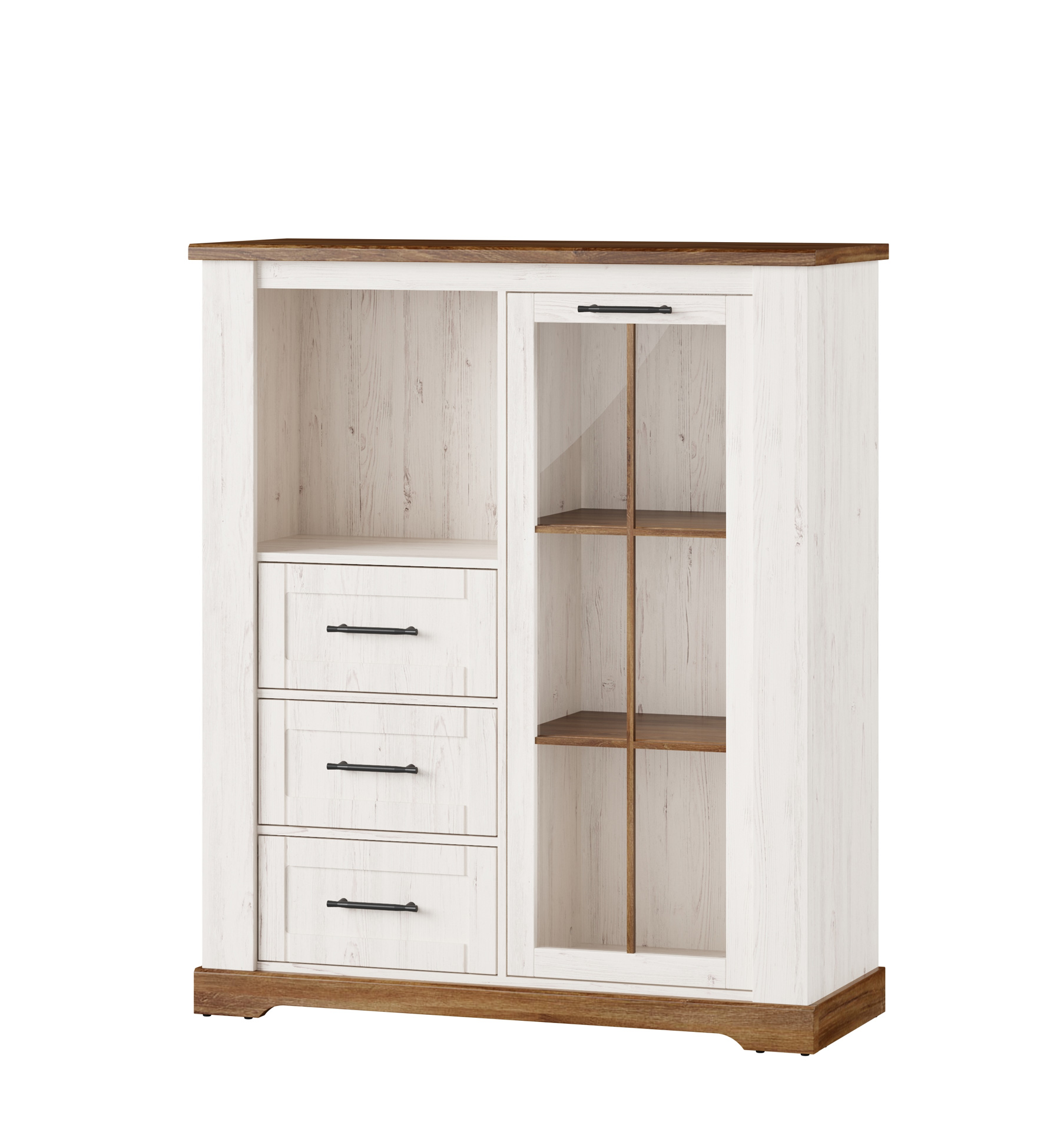 1-dverová vitrína COUNTY s 3-mi zásuvkami vo veľmi obľúbenom vintage & provensal štýle. Dvierka nábytku sú vyrobené z odolnej MDF dosky s vysokým leskom vo farbe dub stirling v kombinácií s borovicou andersen. Korpus nábytku je vyrobený z kvalitnej LTD dosky, ktorá je potiahnutá odolnou fóliou a je ľahká na údržbu. Vnútro vitríny je tvorené policami. Sklo vo vitríne je temperované. Úchytky sú z kovu v čiernej farbe.K vitríne je možné zakúpenie LED osvetlenia za príplatok (viď. Doporučené produkty). K vitríne je takisto možné dokúpenie ďalších elementov z toho istého sektoru, čím si môžete zostaviť obývačku alebo jedálňu podľa svojich predstáv a potrieb.Dodávame v demontovanom stave.