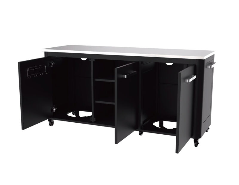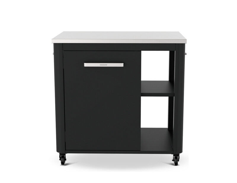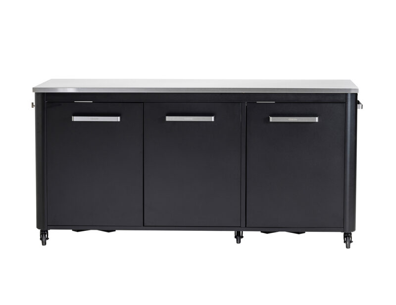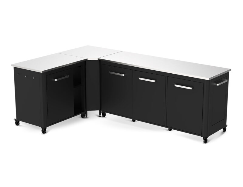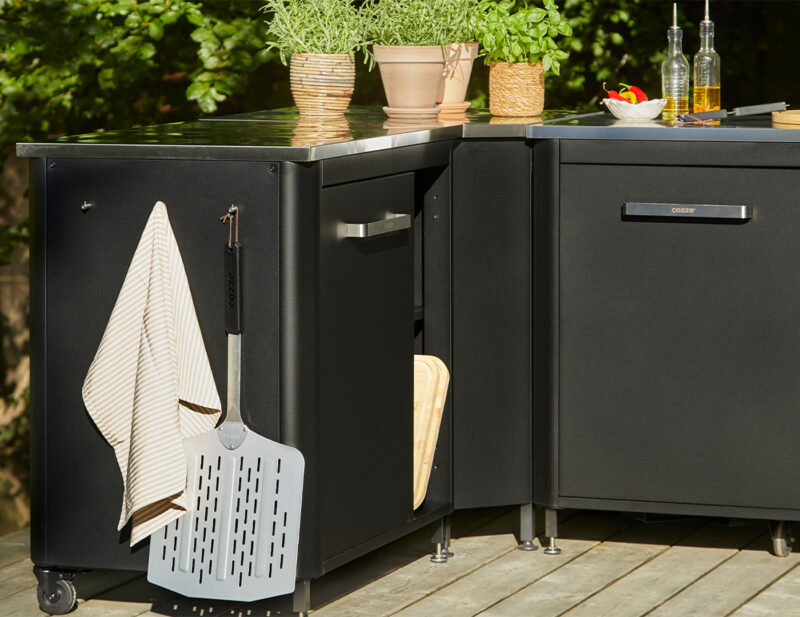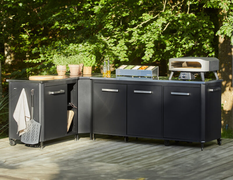 Rohový set záhradnej kuchyne Cozze ponúka maximálnu flexibilitu a úložný priestor. Obsahuje otvorený modul s policami, rohový modul a stôl s tromi dvierkami. Nerezová pracovná plocha, odolná konštrukcia a praktické usporiadanie robia z tohto setu ideálne riešenie pre vonkajšie varenie!