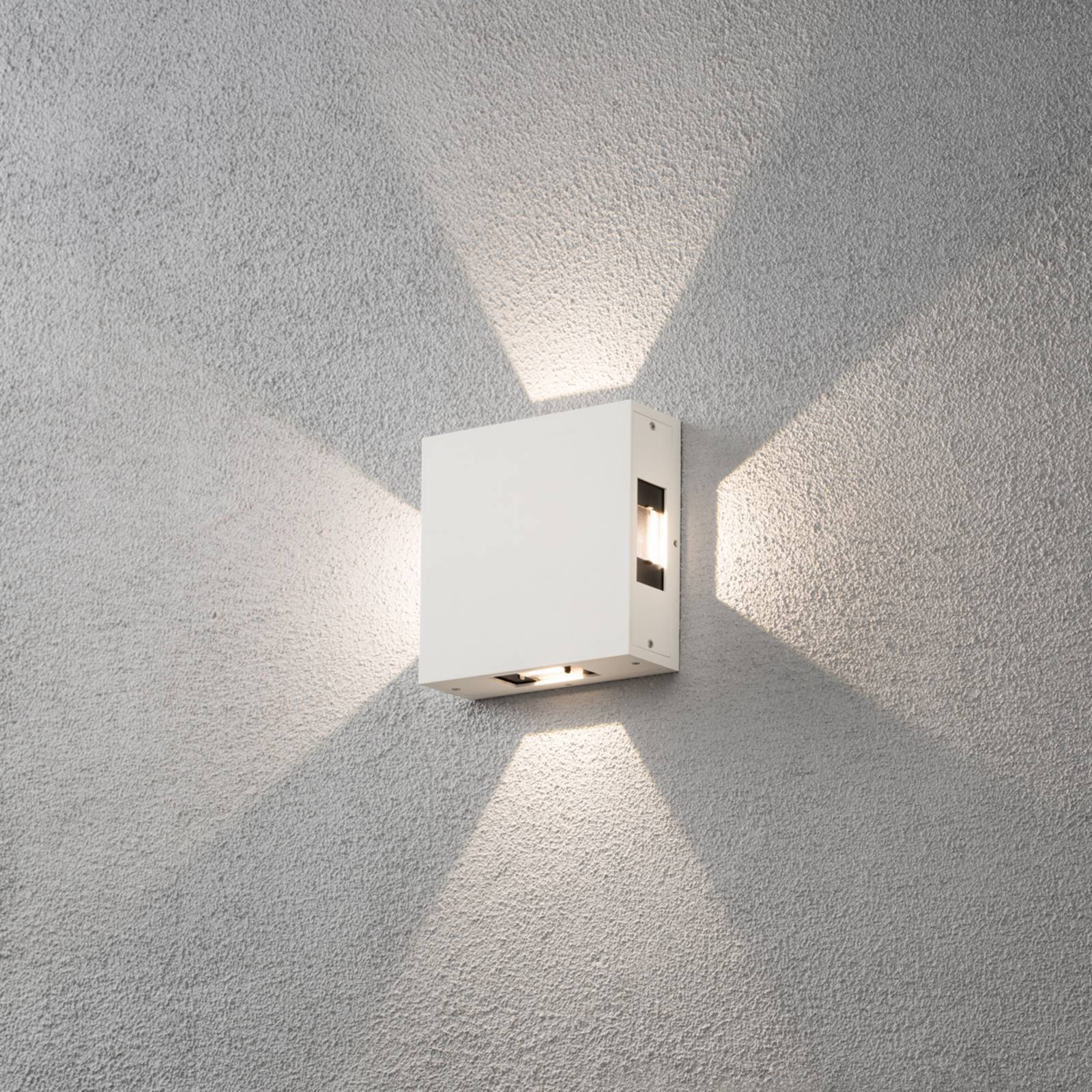 Cremona – biele LED vonkajšie nástenné svetlo s nastaviteľným svetelným lúčom Hranaté, celkom ploché LED vonkajšie nástenné svetlo Cremona zmení vonkajšiu stenu na zvýraznenie. Svetelný lúč je možné individuálne nastaviť v rozsahu od 0 do 90 ° na všetkých štyroch stranách svietidla. Matné biele lakované LED vonkajšie nástenné svetlo vyrobené z hliníka je vybavené štyrmi značkovými LED diódami Edison za priehľadným sklom, ktoré vyžarujú svoje teplé biele svetlo cez nastaviteľné vývody v úzkych alebo širokých uhloch. Toto robí vonkajšie LED nástenné svetlo nielen energeticky úsporným zdrojom svetla, ale aj jedinečnou dekoráciou na stene v tme.