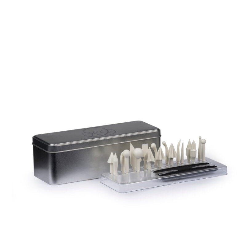 Vzhľadom na osemnásť rôznych nástavcov umožní táto cukrárska súprava od značky Blomsterbergs ľahké, precízne a zároveň detailné modelovanie marcipánových či fondánových dekorácií. Spoločne s dvoma dvojitými rukoväťami sú pri nepoužívaní skladované v kovovej škatuľke.