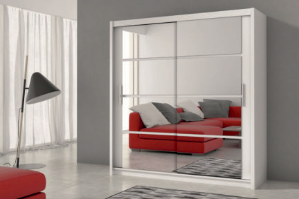 Moderná šatníková skriňa DAKAR 203 zaujme svojim efektným dizajnovým prevedením. Dekoračné zrkadlové pásy členia dvere skrine a vytvárajú štýlový dekor. Nevýrazné úchyty v striebornej farbe dotvárajú celkový vzhľad skrine.Skriňa ponúka posuvný systém otvárania dverí. Vyrobená je z kvalitnej LTD dosky, nenáročnej na údržbu. Farebné prevedenie: biele. V našej ponuke nájdete túto skriňu aj v čiernom farebnom prevedení.Vnútorné členenie skrine nájdete na priloženej fotografii. Oceníte praktické rozdelenie priestoru na viacero poličiek a priestor na vešanie oblečenia so šatnou tyčou.Rozmer (š/v/h): 203 x 215 x 61cm. V ponuke tiež šírka 160 cm.Dodávame v demonte.