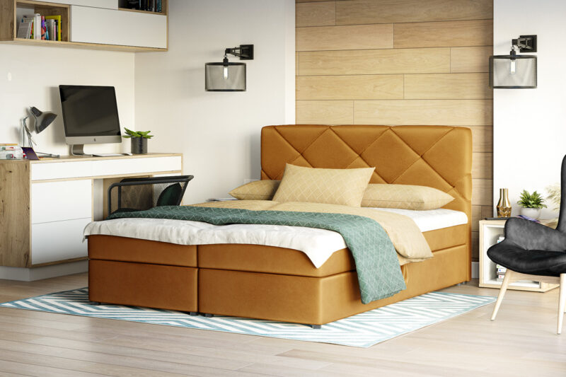 Štýlová manželská posteľ DALILA je v modernom a elegantnom prevedení. Patrí medzi postele typu BOXSPRING. Výrazným dizajnovým prvkom je jej čelo, ktoré tiež ochráni vašu stenu pred oderom.Posteľ je čalúnená látkou ITAKA 33. Súčasťou postele je kvalitný bonellový matrac. Pre väčší komfort si môžete dokúpiť praktický vrchný krycí matrac TOPPER (viď. doporučené produkty).Disponuje veľkým úložným priestorom, ktorý je vhodný na uloženie perín, obliečok a podobne.Rozmery (š,v,h): 145 x 102 x 208 cm. Výška čela postele: 102 cm. Výška spacej plochy: 47 cm. Výška nožičiek: 2 cm. Spacia plocha: 140 x 200 cm.V našej ponuke nájdete aj ďalšie prevedenia a rozmery manželských postelí DALILA.Dodávame v demontovanom stave.