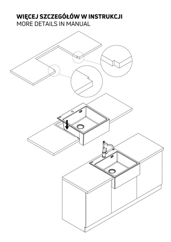 POZORNOSŤ! Špeciálny spôsob montáže – modulárny, umiestnený. Podrobnosti v návode. Pripravte otvor nad skrinkou podľa rozmerov drezu. Perfektná nad 60 cm skrinku.