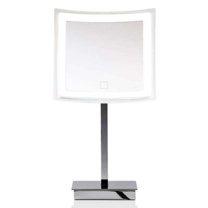 Stojanové kozmetické zrkadlo LED BS 83 Touch pre individuálne osvetlenie od teplej bielej po denné svetloBS 83 Touch je moderné stojanové zrkadlo LED vybavené mnohými funkciami. Vizuálne upúta štvorcové sklo zrkadla s LED obklopením a ďalším akrylovým obklopením. Celkový lesklý dojem podčiarkuje pochrómovaný podstavec a tyč, ktorá drží zrkadlové sklo s 5-násobným zväčšením. zabudované LED diódy možno zapínať a vypínať dotykovým spínačom a stmievačom a farbu svetla možno plynule regulovať od teplej bielej až po denné svetlo. BS 83 Touch je vybavené funkciou automatického vypnutia, ktorá svetlo po 10 minútach automaticky vypne. Svetelný zdroj sa napája tromi batériami AA 1,5 V (sú súčasťou dodávky).