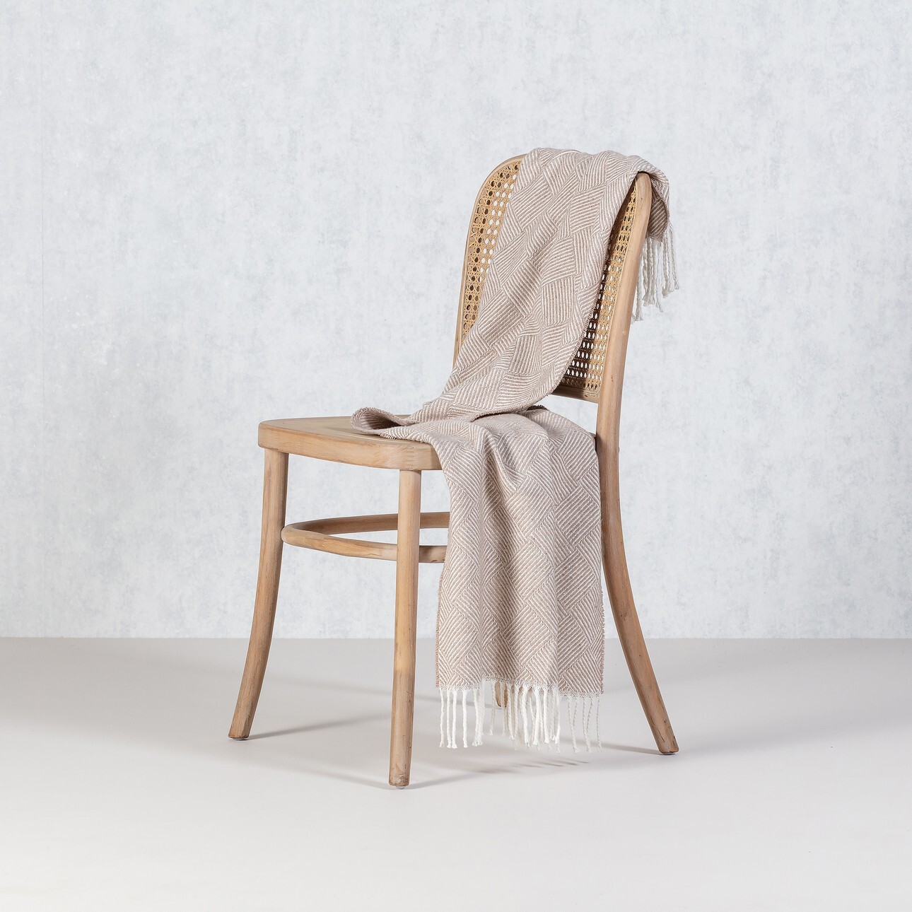 Béžová deka s geometrickým vzorom a ozdobnými strapcami.