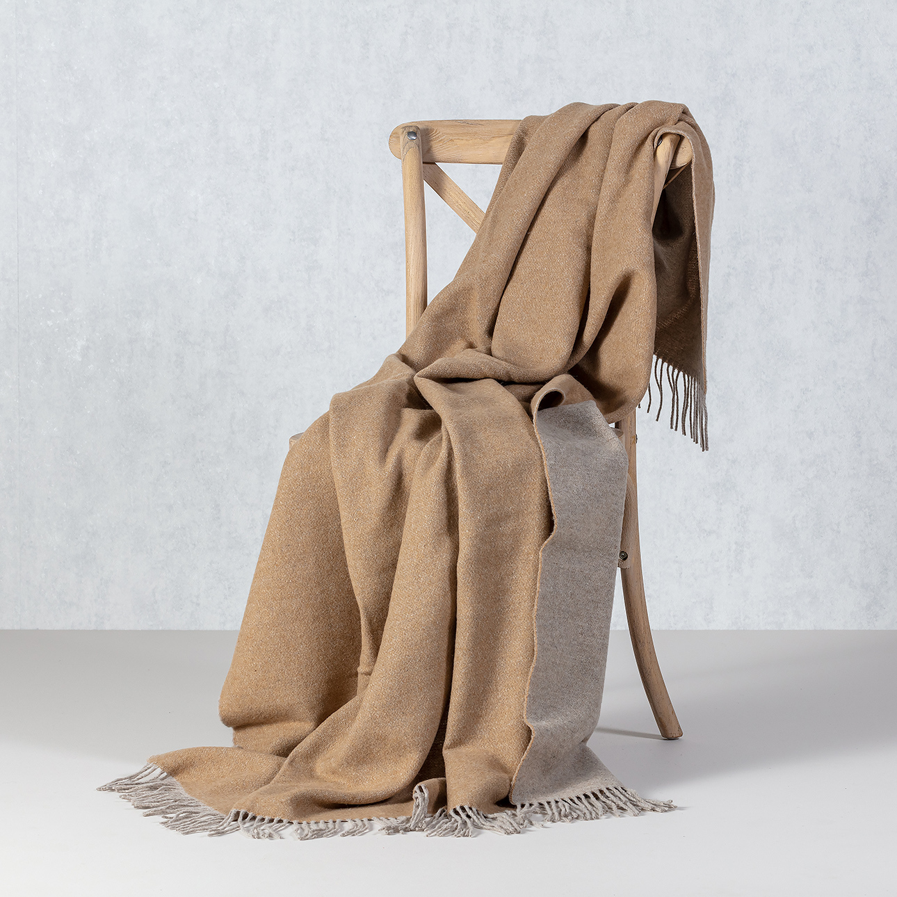 Obojstranná deka z merino vlny v karamelovej farbe s ozdobnými strapcami.