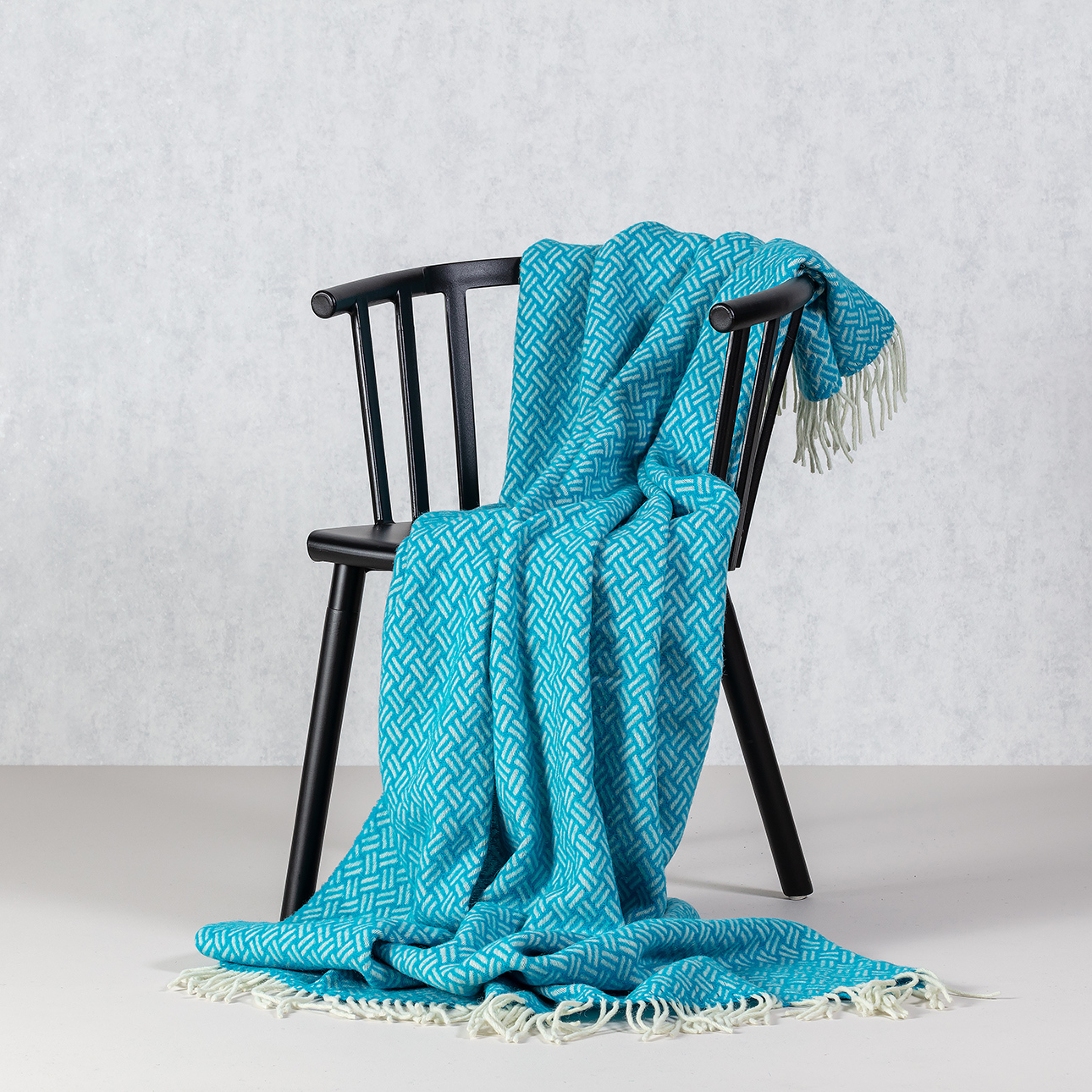 Príjemná vlnená deka, hrejivá s jemným vzorom v nádhernej tyrkysovej modrej farbe so svetlými strapcami po oboch stranách. Je vyrobená z kvalitnej vlny. Vhodná pre chladné večery na terase, alebo záhrade.