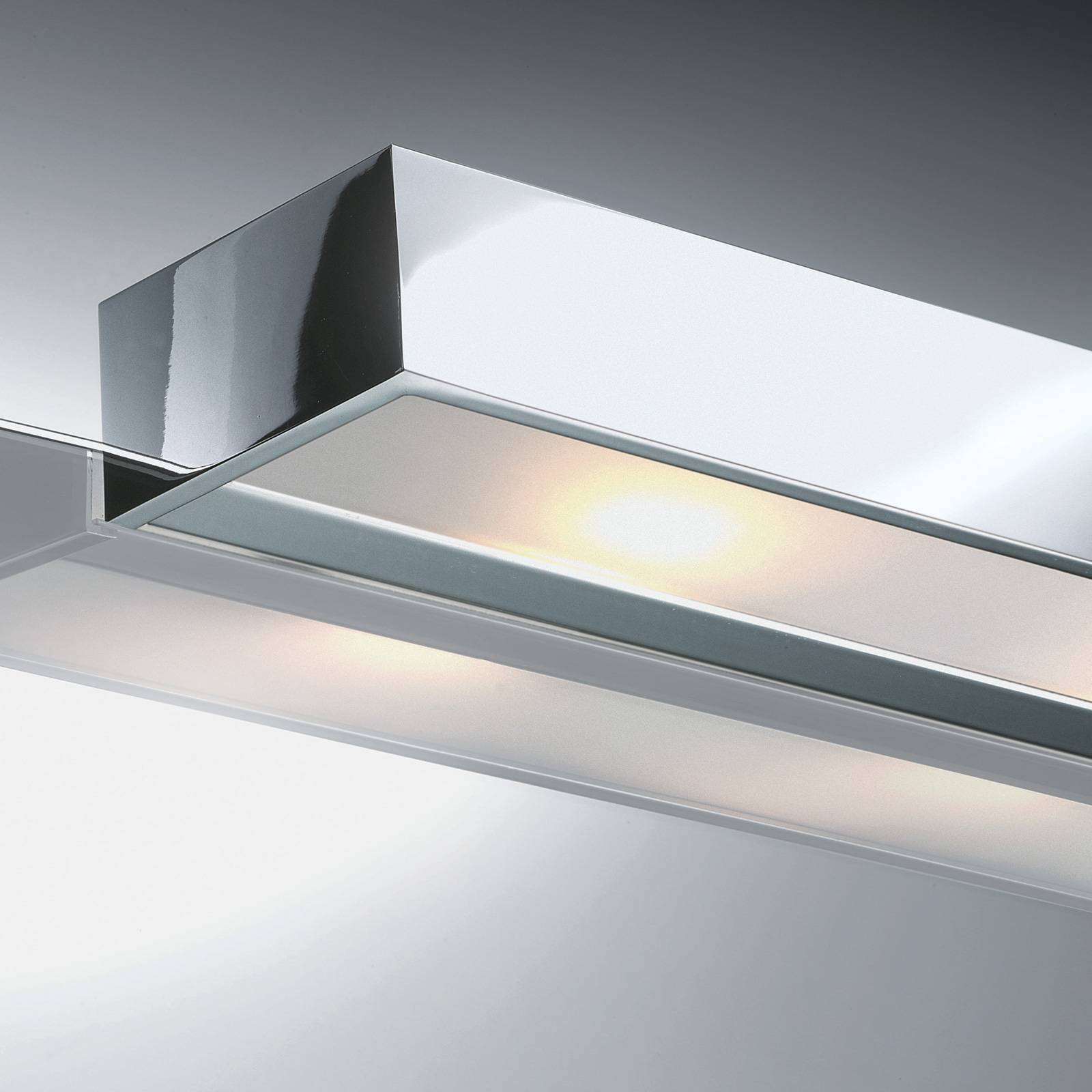 Zásuvné zrkadlové svetlo Box N LED – brilantné osvetlenie pre kúpele a wellness priestory Box N je jednoduché obdĺžnikové zrkadlové svetlo z pochrómovaného kovu na pripevnenie na bežné zrkadlá s maximálnou hrúbkou 6 mm. Vyžarovaním svetla smerom nahor a nadol sa teplé biele svetlo zo zabudovaných LED diód rovnomerne a bez oslnenia šíri cez difúzory do miestnosti. Toto svietidlo možno inštalovať nielen do obývacích izieb, ale aj do kúpeľných a wellness priestorov, pretože má ochranu proti striekajúcej vode IP44. Bez ohľadu na to, či má byť obzvlášť jasné na nanášanie make-upu alebo skôr útulné na kúpeľný kúpeľ – LED diódy možno stlmiť na požadovaný jas ich spojením s fázovým stmievačom na koncovej hrane.