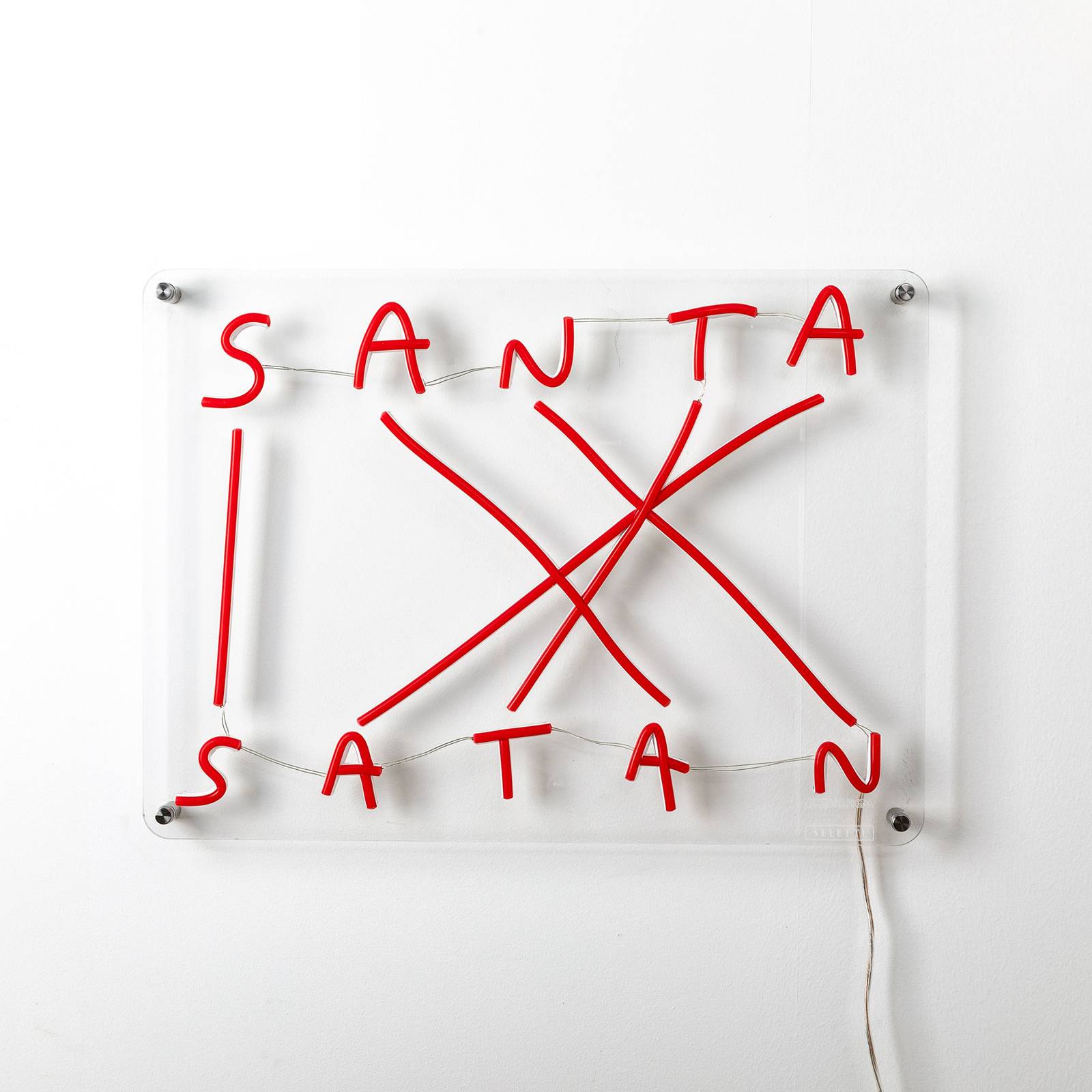 LED dekoratívne nástenné svietidlo s anagramom „Santa-Satan“, červené LED svetelné pásyZábavný príklad použitia štylistických prostriedkov anagram a antonymum predstavuje toto LED nástenné svietidlo. „Santa-Satan“ je vybavený červenými silikónovými trubicami LED, ktoré predstavujú uvedené pojmy, ktoré sú protikladné, ale vytvorené z rovnakých písmen. LED pásiky sú upevnené pomocou priehľadnej akrylovej dosky. Nástenné svietidlo LED je navrhnuté v štýle farebného neónového osvetlenia a je ideálne na dekoratívne osvetlenie interiéru – Vybavené káblom so zástrčkou a stmievacím spínačom – Dizajn: Nico Vascellari, Codalunga & Seletti