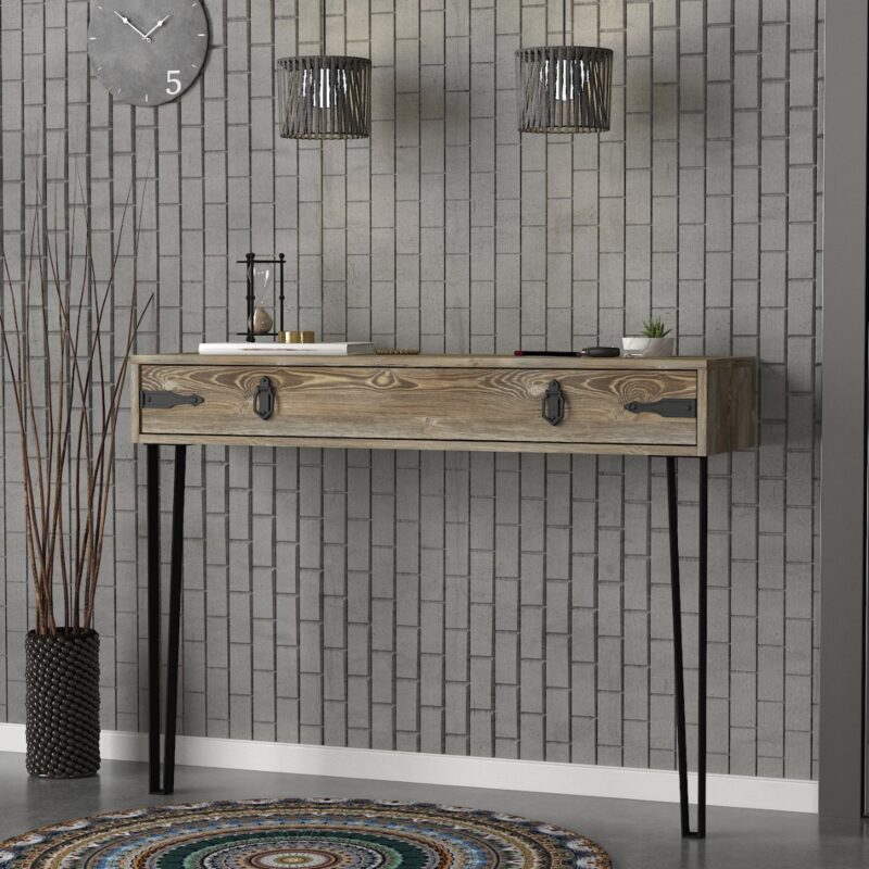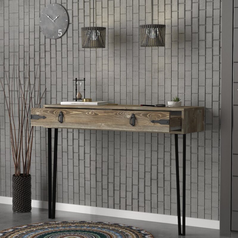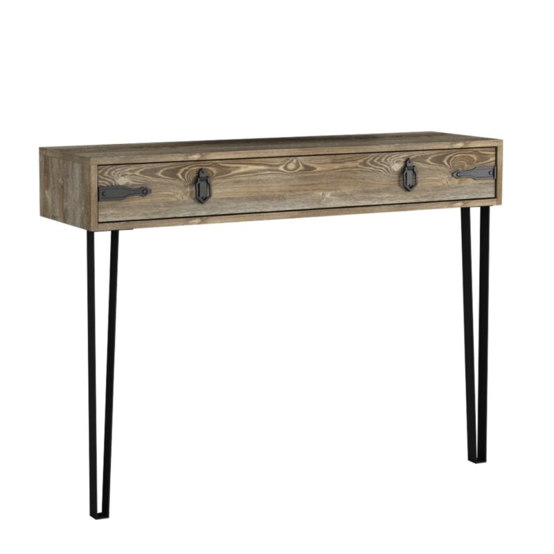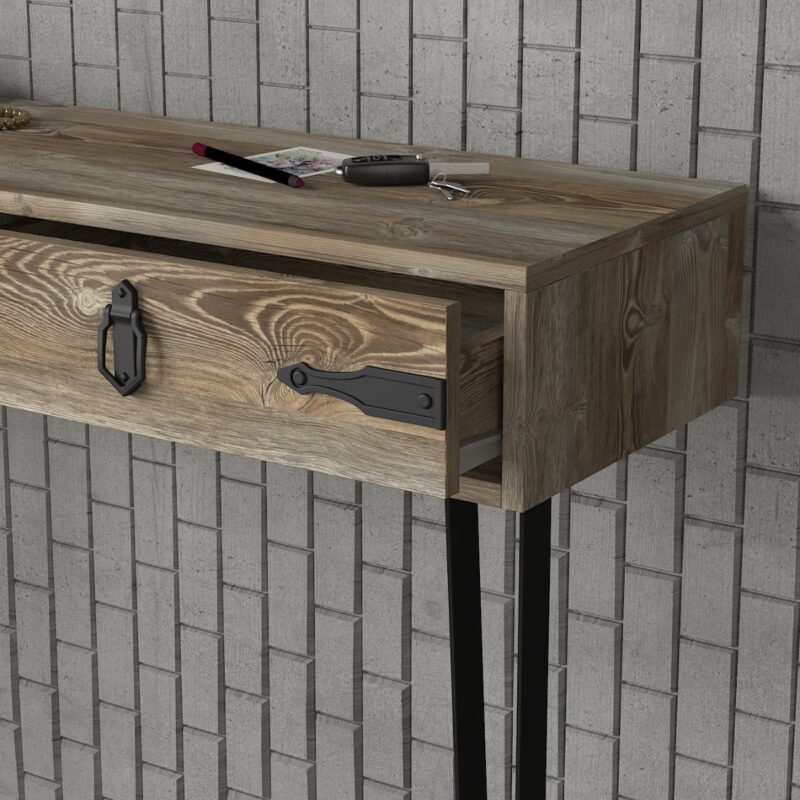 Konzolový stolík DELUXE COSTA slúži ako ideálny odkladací priestor v predsieni, či v akejkoľvek inej časti vášho interiéru. Dotvára celkový obraz interiéru a slúži aj ako dizajnový doplnok.Stolík je zaujímavý aj vďaka svojim čiernym kovovým nožičkám, ktoré produktu dodávajú industriálny charakter a celkový dojem dotvára zaujímavá stolová doska vo farebnom prevedení orech. Stolík disponuje praktickou zásuvkou na uschovanie drobností. Vyrobený je z kvalitnej LTD dosky hranený páskou PVC.Rozmery: (š/h/v) 120 x 35 x 90 cm. (ostatné rozmery v nákrese)Dodávame v demonte.
