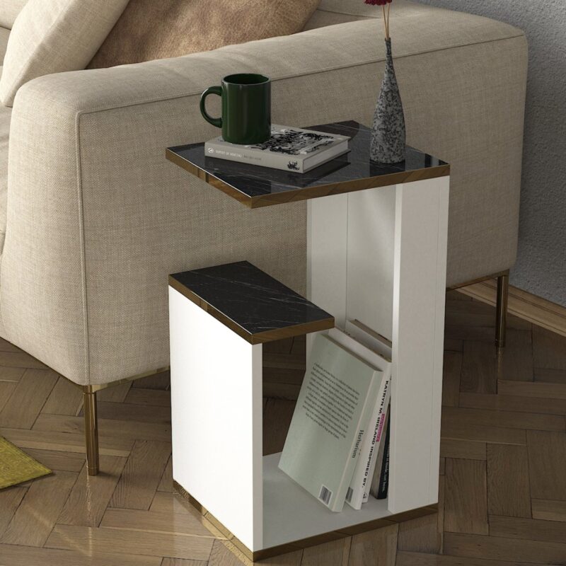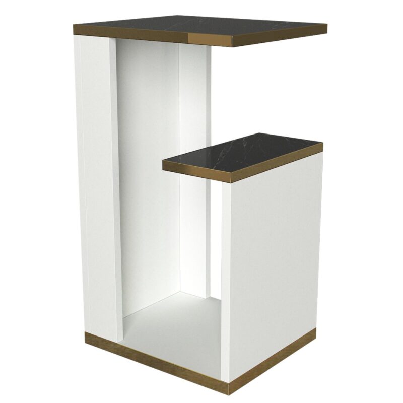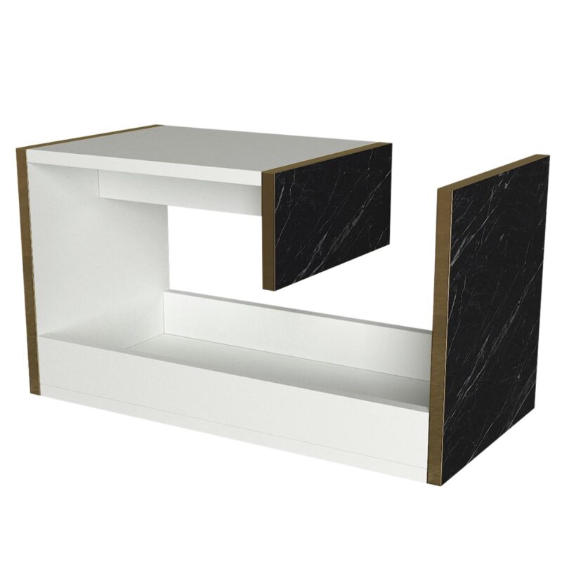 Príručný stolík DELUXE RAVENA je v jednoduchom prevedení a zaujímavom tvare, vhodný na odloženie kníh, časopisov a ostatných drobností, ktoré chcete mať vždy po ruke. Zaujímavosťou stolíka je jeho použitie na šírku aj na výšku, takže ho viete využívať presne tak, ako v daný moment potrebujete. Stolík sa ľahko kombinuje s akýmkoľvek nábytkom a vďaka svojmu farebnému prevedeniu v kombinácii biela + čierny mramor a dizajnové prvky v zlatej farbe, bude ozdobou nejedného interiéru. Materiál: kvalitné LTDFarebné prevedenie: biela matná / čierny mramorRozmery: (š/h/v) 60 x 29,5 x 35 cm (ostatné rozmery v nákrese)Dodávame v demonte.