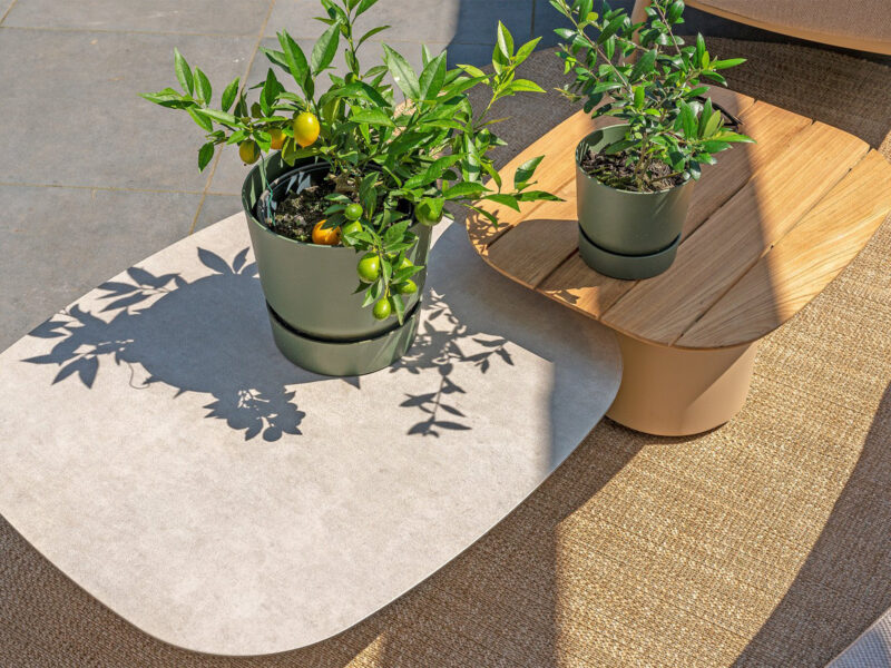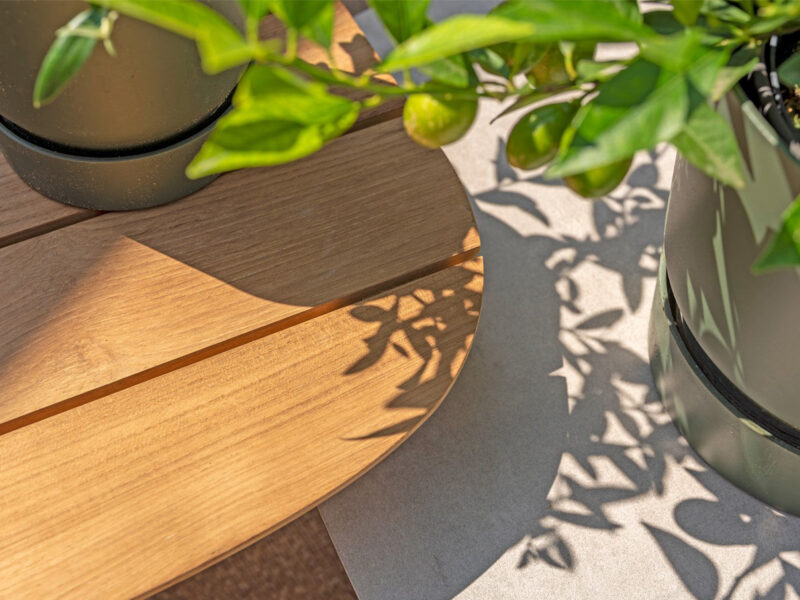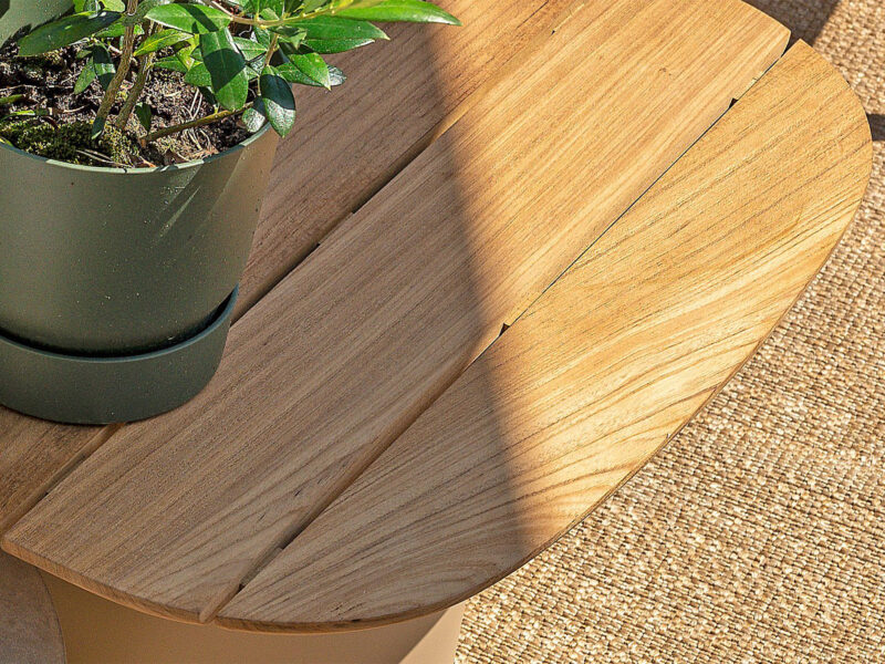 Elegantný set konferenčných stolíkov Demi kombinuje keramiku, teak a hliník v nadčasovom dizajne.