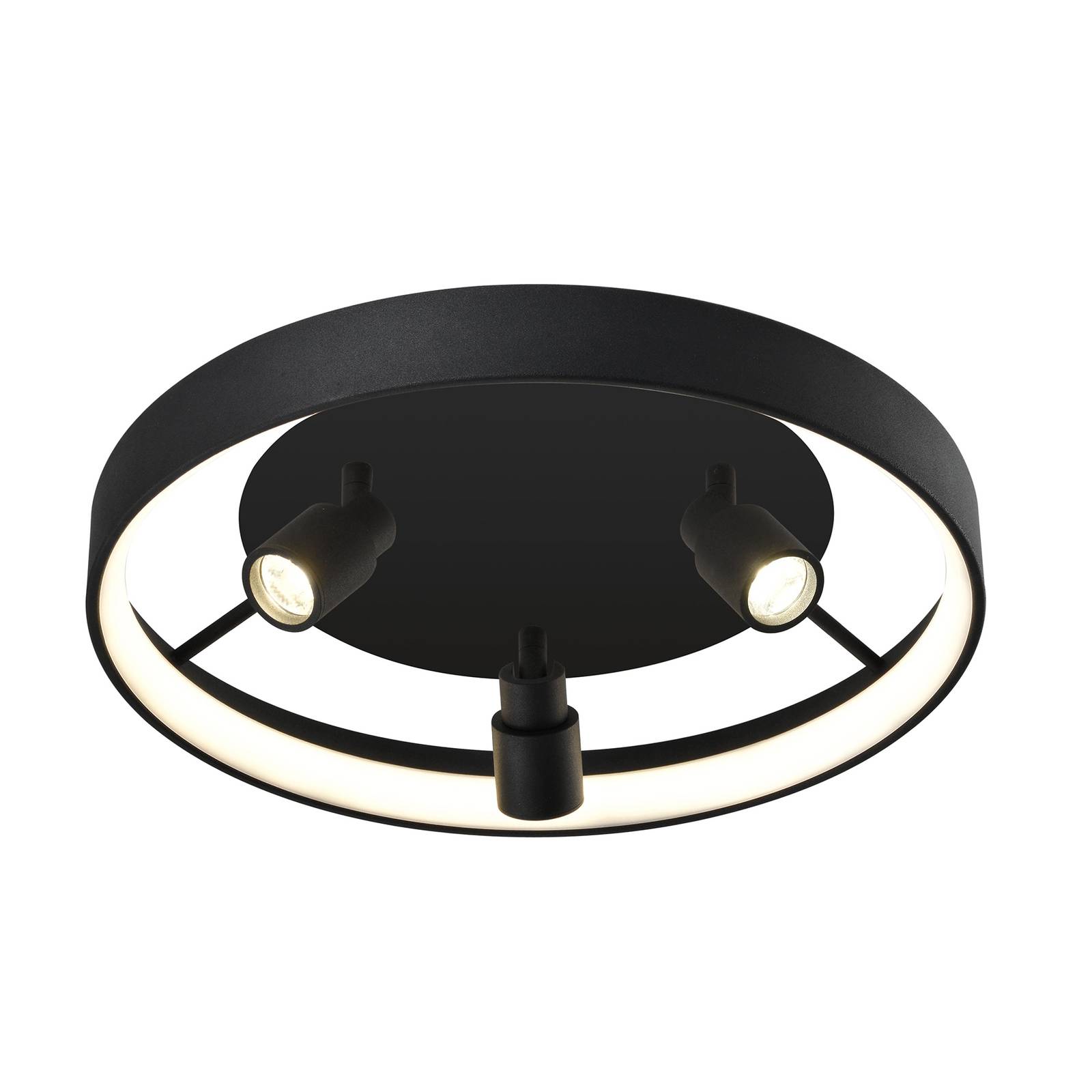 LED stropné svietidlo Denis – osvetlený prstenec s 3 ďalšími bodmi Denis je LED stropné svietidlo pozostávajúce z čierneho hliníkového prstenca s LED diódami na vnútornej strane. Okrem LED diód zabudovaných v prstenci poskytujú optimálne osvetlenie miestnosti aj tri spoty pripevnené na stropnej doske. Smer spotov sa dá nastaviť, takže svetlo sa dá úplne prispôsobiť osobným požiadavkám.