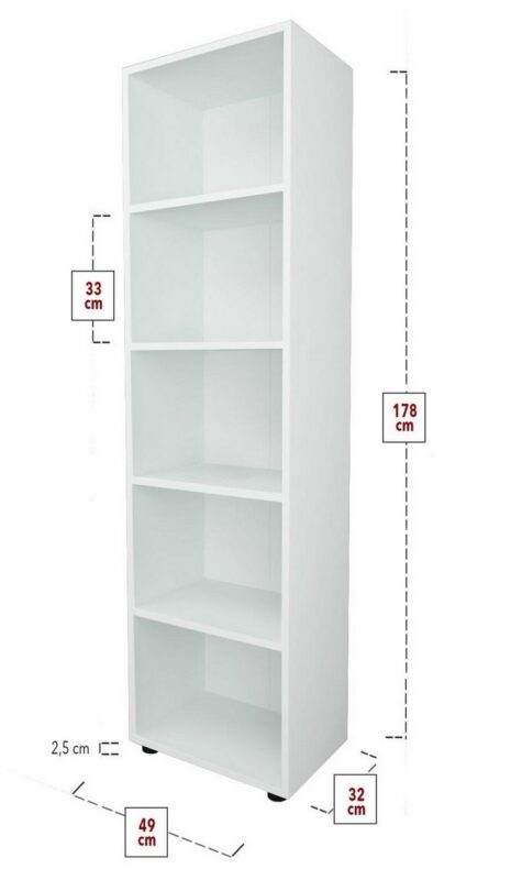 Moderný dizajnový regál DENISSA je v štýlovom a modernom prevedení. Je vhodný do pracovne, kancelárie či detskej izby.Tento dizajnový regál je vyrobený z kvalitnej LTD dosky, ktorá je nenáročná na údržbu. Hrúbka dosky – 18 mm. Farba: biela.Rozmery:Výška produktu: 178 cmŠírka produktu: 49 cmHĺbka produktu: 32 cmVýška medzi policami: 33 cmVýška nohy: 2,5 cmDodávame v demontovanom stave.