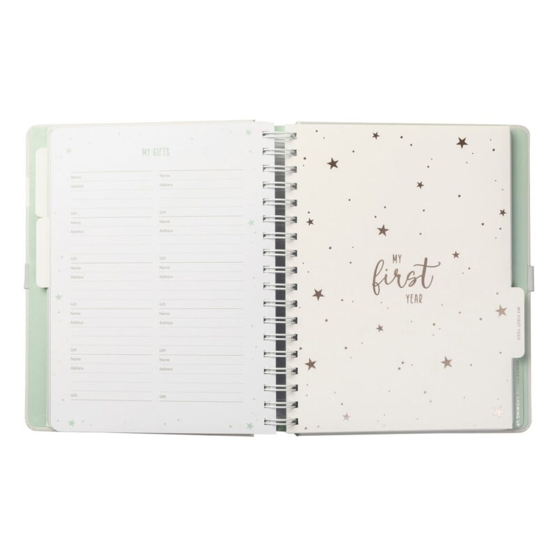 Zaznamenávajte si každý krok vášho dieťaťa už od prvého dňa. V denníku nájdete stránky s priestorom na fotky, zapisovanie spomienok a na odtlačky rúk. Rovnako v ňom nájdete napríklad rodokmeň. Dôležitú súčasť tvoria aj štyri vrecká a samolepky, na zvýraznenie tých najlepších momentov.