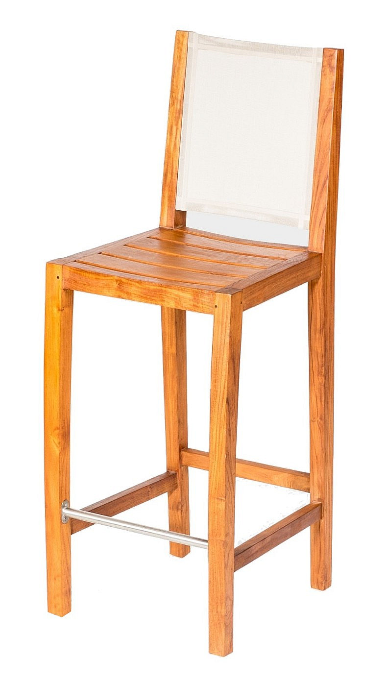 Masívna barová stolička MERY vyrobená z kvalitného indonézskeho teaku. Drevená stolička je vďaka zosilnenej konštrukcii pevná a stabilná. Opierka stoličky je vyplnená špeciálnou tkaninou batyline. Batyline je výnimočná, veľmi pevná a tvarovo stála technická tkanina odolná voči UV žiareniu, ktorá neabsorbuje okolitú teplotu či vlhkosť. Táto tkanina je vyrábaná francúzskou firmou Ferrari Group je vyrobená z recyklovateľného materiálu s certifikáciou ISO 14001. Nohy sú chránené plastovými krytkami. Ošetrená teakovým olejom.