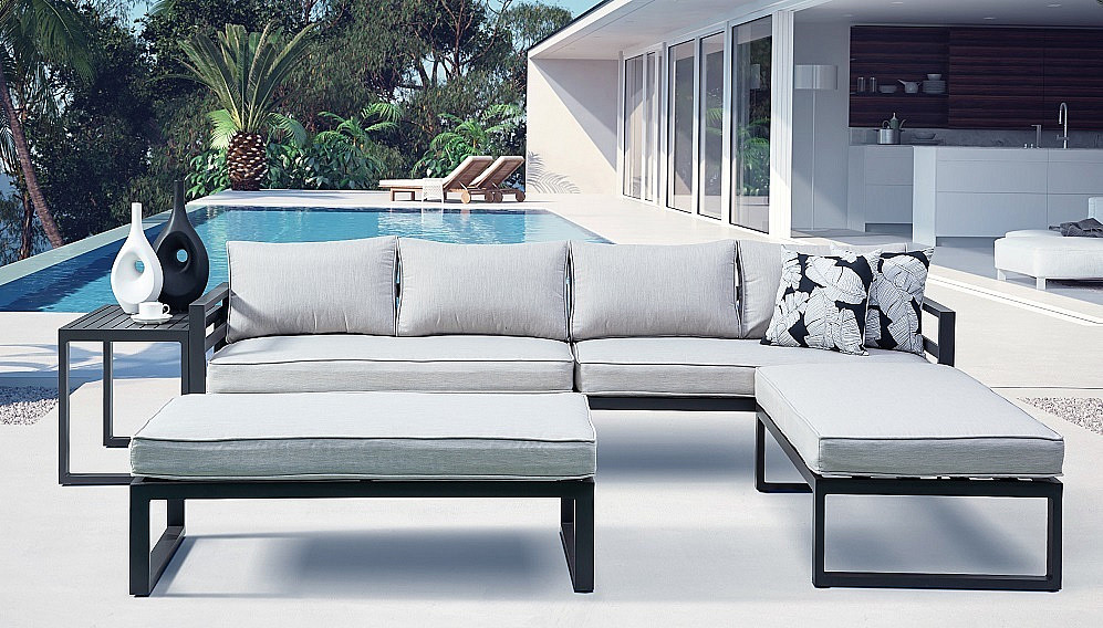 Luxusná súprava s hliníkovou konštrukciou, ktorá je pokrytá šedou práškovou farbou.