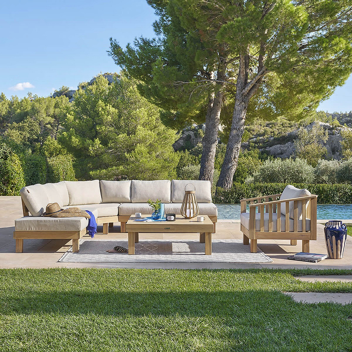 Záhradná zostava z exotickej dreviny akácie má všetko, čo tvorí atmosféru prírodného posedenia.