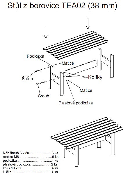 Stôl je dodávaný v demonte vrátane spojovacích materiálov (skrutky, podložky, krídlové matice)