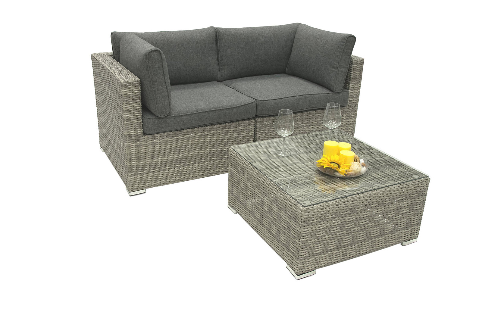 Nastaviteľná rovinnosť pomocou nožičiek. Sestava obsahuje: 2x Ratanový rohový diel SEVILLA (sivá), 1x Ratanový stolík/taburet SEVILLA (sivá)