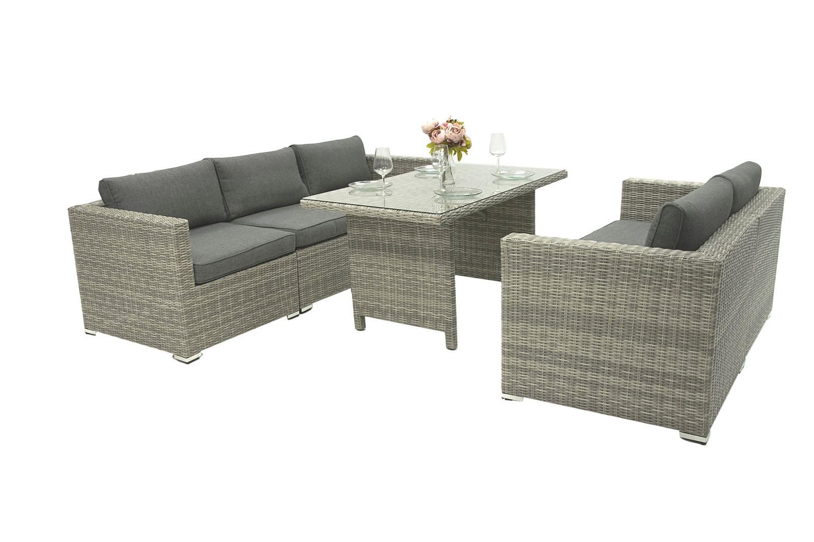 Ratanový nábytok z kolekcie modulových setov, ktorý vyniká svojou variabilitou.Zostavte si súpravy podľa Vašich predstáv.Umelý ratan sa pýši svojím nadčasovým dizajnom a takmer nulovú údržbou. Polyetylénové vlákno sa vyznačuje vysokou pružnosťou, pevnosťou a odolnosťou voči vlhkosti i UV žiareniu. Je odolný voči povětrmostním podmienkam a je vhodný na celoročné státie vonku (odporúčame pod zastrešením alebo ochranným obalom v zimných mesiacoch). Umelý ratan je ľahký, takže zaisťuje pohodlnú manimulaci záhradného nábytku po záhrade či terase.Konštrukcia je vyrobená z robustnej hliníkovej konštrukcie, ktorá je zvarená tak, aby zaistila vysokú nosnosť jednotlivých prvkov. Hliník sa vyznačuje vysokou odolnosťou a pevnosťou. Nedochádza ku korózii.Polstrovanie je v sile 10 cm, jedná sa o látku s hustotou 220 g/m2. Lemovanie po krajoch. Penová výplň. Všetky podušky sú vybavené zipsom. Možnosť prania v práčke na 40 ° C bez aviváže.