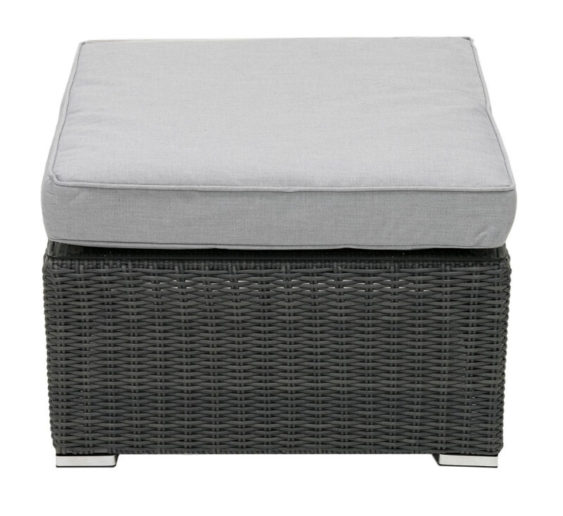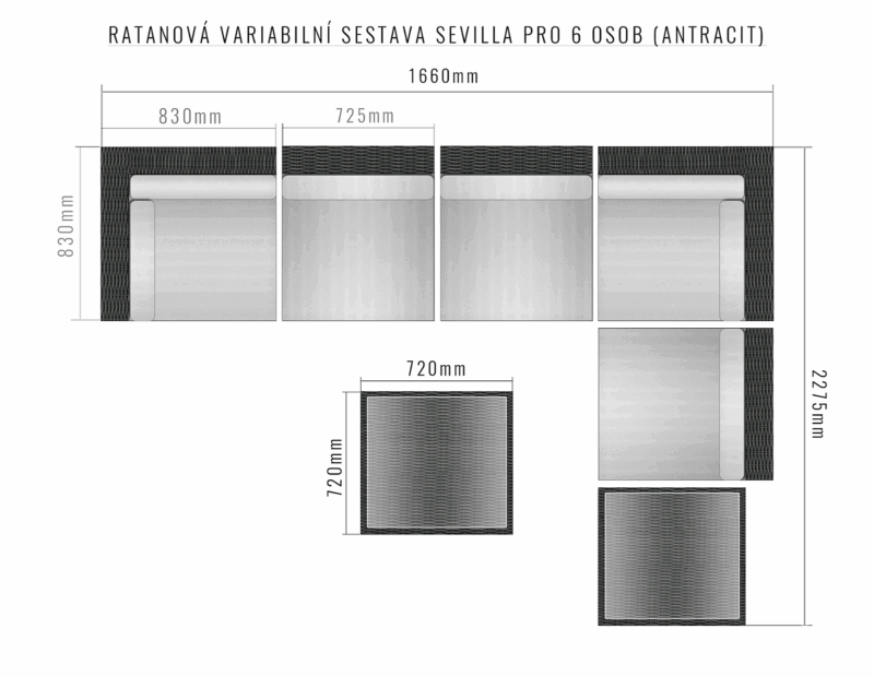 Nastaviteľná rovinnosť pomocou nožičiek. Sestava obsahuje: 2x Ratanový rohový diel SEVILLA (antracit), 2x Ratanový stolík/taburet SEVILLA (antracit), 3x Ratanový stredový diel SEVILLA (antracit)