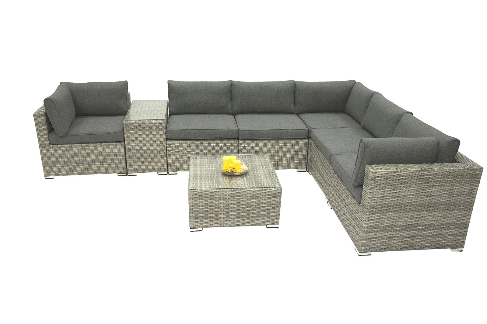 Nastaviteľná rovinnosť pomocou nožičiek. Sestava obsahuje: 3x Ratanový rohový diel SEVILLA (sivá), 3x Ratanový stredový diel SEVILLA (sivá), 1x Ratanový stolík/taburet SEVILLA (sivá), 1x Ratanový stolek bočný SEVILLA (sivá)