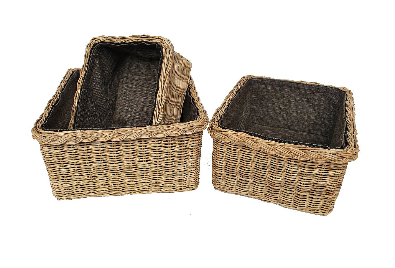 Vyrobené z veľmi pružného, pevného, jemného ratanu Srimit. Vnútro košíka je obšitý kvalitnou látkou, ktorá je prichytená suchým zipsom. Rozmery 30 × 25 × 15 cm, 36 × 31 × 17 cm a 42 × 37 × 19 cm.