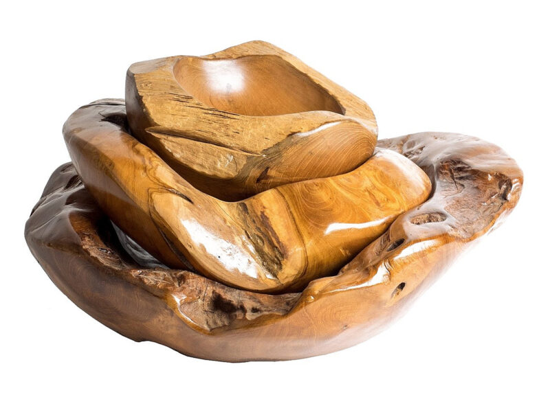 Miska je vyrobená z naplavených teakových kmeňov. Deštruktívna činnosť vodného živlu je na okrajoch zámerne ponechaná. Ošetrené lakom.