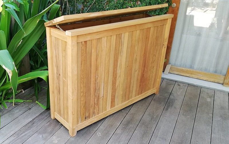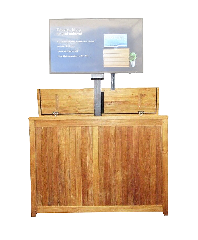 Originálna drevená TV skrinka z kvalitného indonézskeho teaku. Bola vyrobená na prianie zákazníkov, ktorí chceli mať ukrytú televíziu na svojej terase. Súčasťou je mechanický výsuv s diaľkovým ovládaním. Naše výrobky sú určené ako do interiéru, tak aj na vonkajšie použitie s dlhou životnosťou. Ideálna na kryté terasy, zimné záhrady, wellness, terasy kaviarní, reštaurácií a pod. Skrinka nie je vodotesná, nesmie byť vystavená dažďu. Televízna skrinka je určená pre veľkosť TV max. 55“ palcov (127 cm). Horná časť televízie pri maximálnom výsuve dosahuje cca 190 cm. Výšku výsuvu je možné jednoducho nastaviť diaľkovým ovládačom. Ošetrené olejom, možno dodať aj v prírodnom neošetrenom stave.