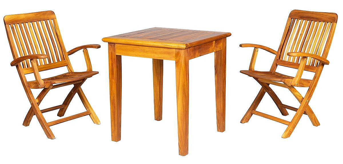 Sestava obsahuje: 1x Teakový stôl DANTE, 2x Skladacie teakové kreslo ANGELO