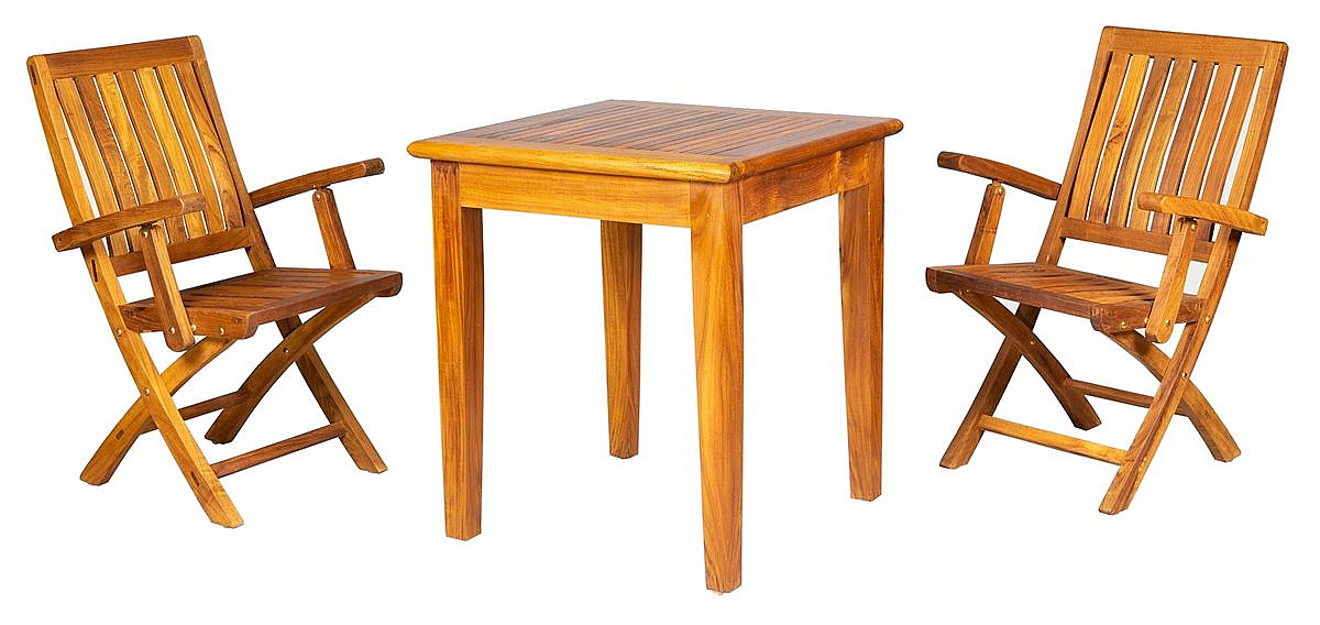 Sestava obsahuje: 1x Teakový stôl DANTE, 2x Skladacie teakové kreslo DORIS