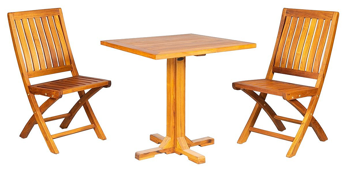 Sestava obsahuje: 1x Teakový stôl DANTE, 2x Skladacia teaková stolička NOEMI
