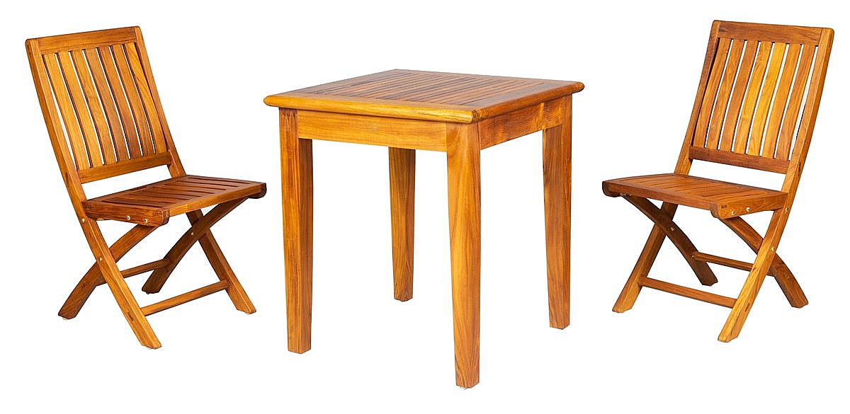 Sestava obsahuje: 1x Teakový stôl DANTE, 2x Skladacia teaková stolička NOEMI