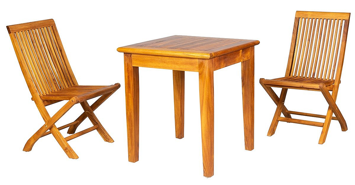 Sestava obsahuje: 1x Teakový stôl DANTE, 2x Skladacia teaková stolička PINA