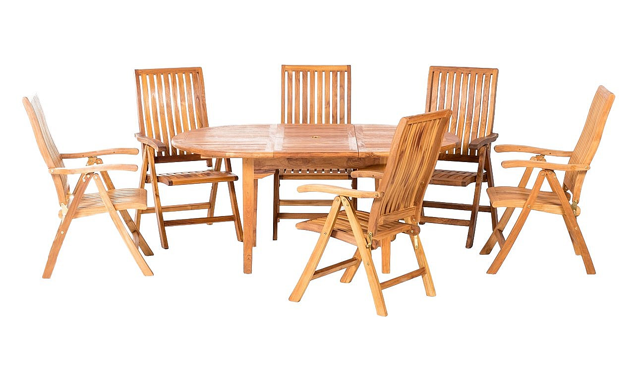 Sestava obsahuje: 1x Teakový stôl ELEGANTE, 6x Skladacie teakové kreslo RIVA