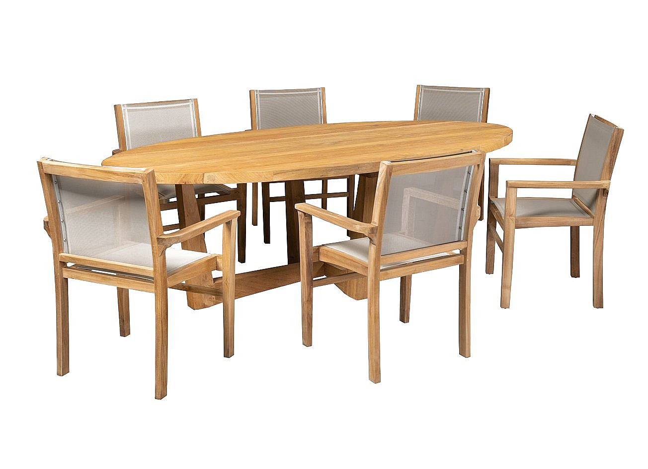 Sestava obsahuje: 1x Teakový stôl FLORES RECYCLE, 6x Teakové kreslo ROMA NEW