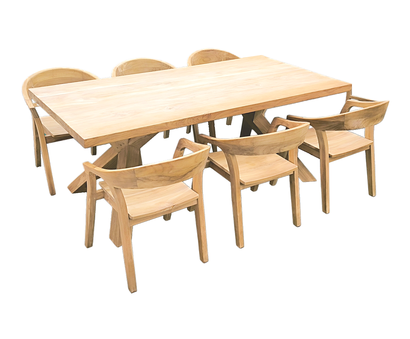 Stôl z prémiového teaku. Doska stola je precízne vyleštená. Stôl je určený hlavne na vašu terasu či záhradu, ale svojou originalitou doplní moderný štýl aj vášho interiéru. Táto zostava sa obsahuje 6× stolička Isabella a stôl z nového teaku 200×100 cm. Drevo teak nie je len krásne a elegantné, ale aj neuveriteľne odolné.