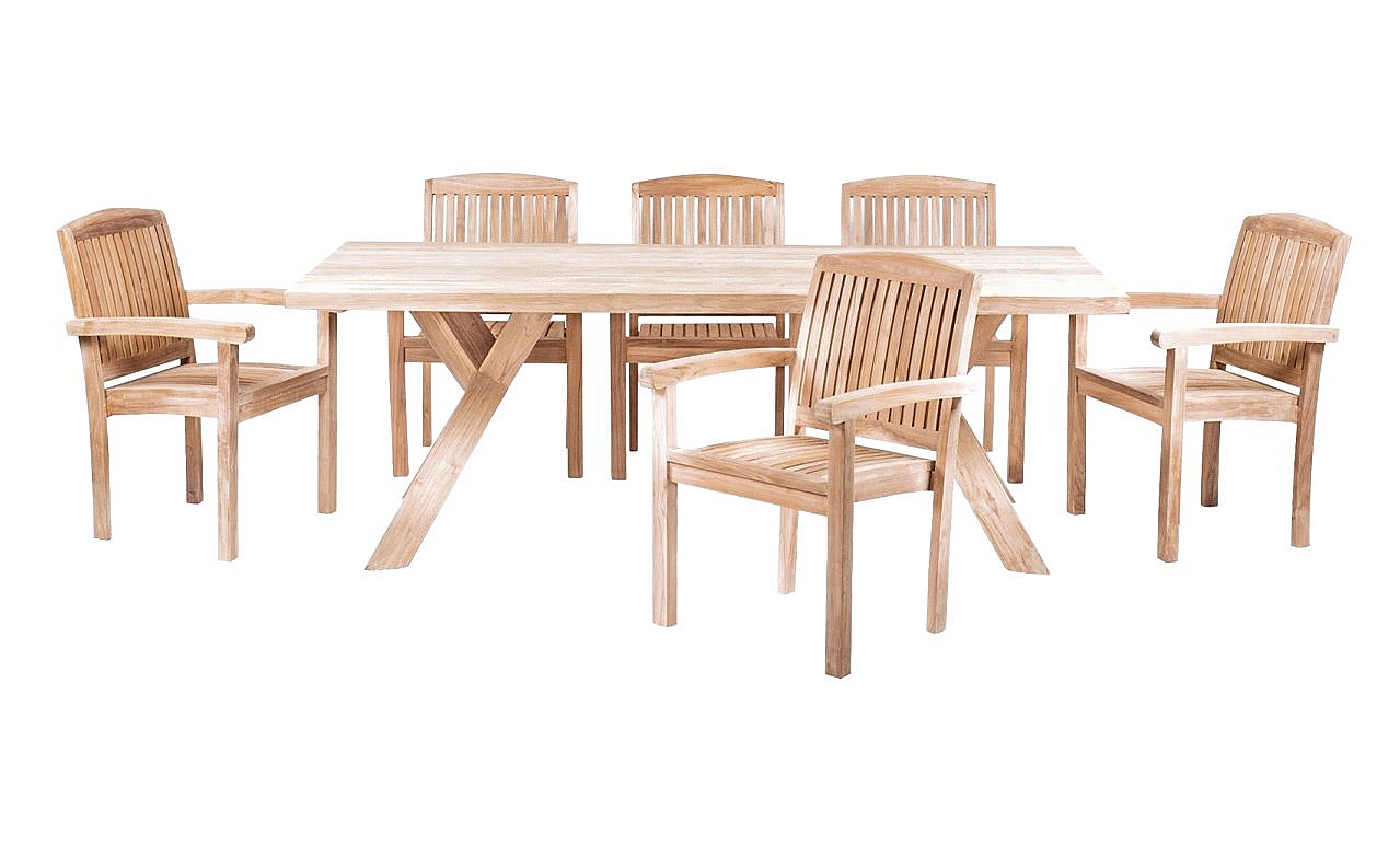 Sestava obsahuje: 1x Teakový stôl SPIDER RECYCLE, 6x Teakové kreslo PARIS