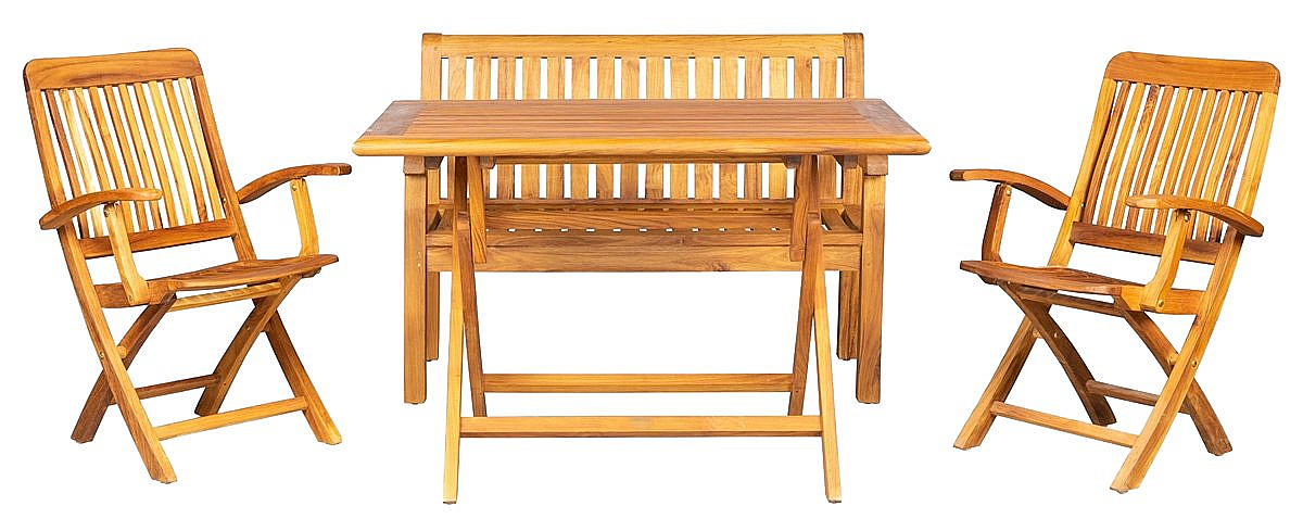 Sestava obsahuje: 1x Teakový skladací stôl VASCO, 2x Skladacie teakové kreslo ANGELO, 1x Teaková lavica PIETRO